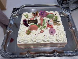 スポンジ生地からトッピングのマカロンまで、すべて心を込めて手作りした特製ケーキです。皆さん今年も大変喜ばれました。